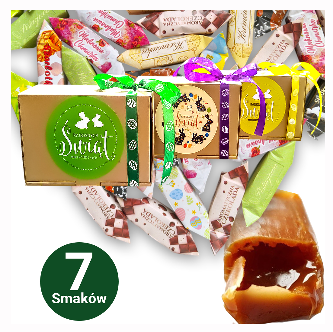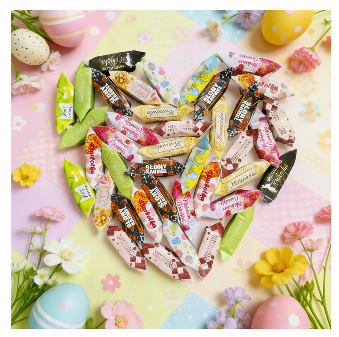 ✅ Kolorowe krówki w tematycznych, wielkanocnych obwolutach z różnorodnymi świątecznymi grafikami (pisanki, kurczaczki, króliki).