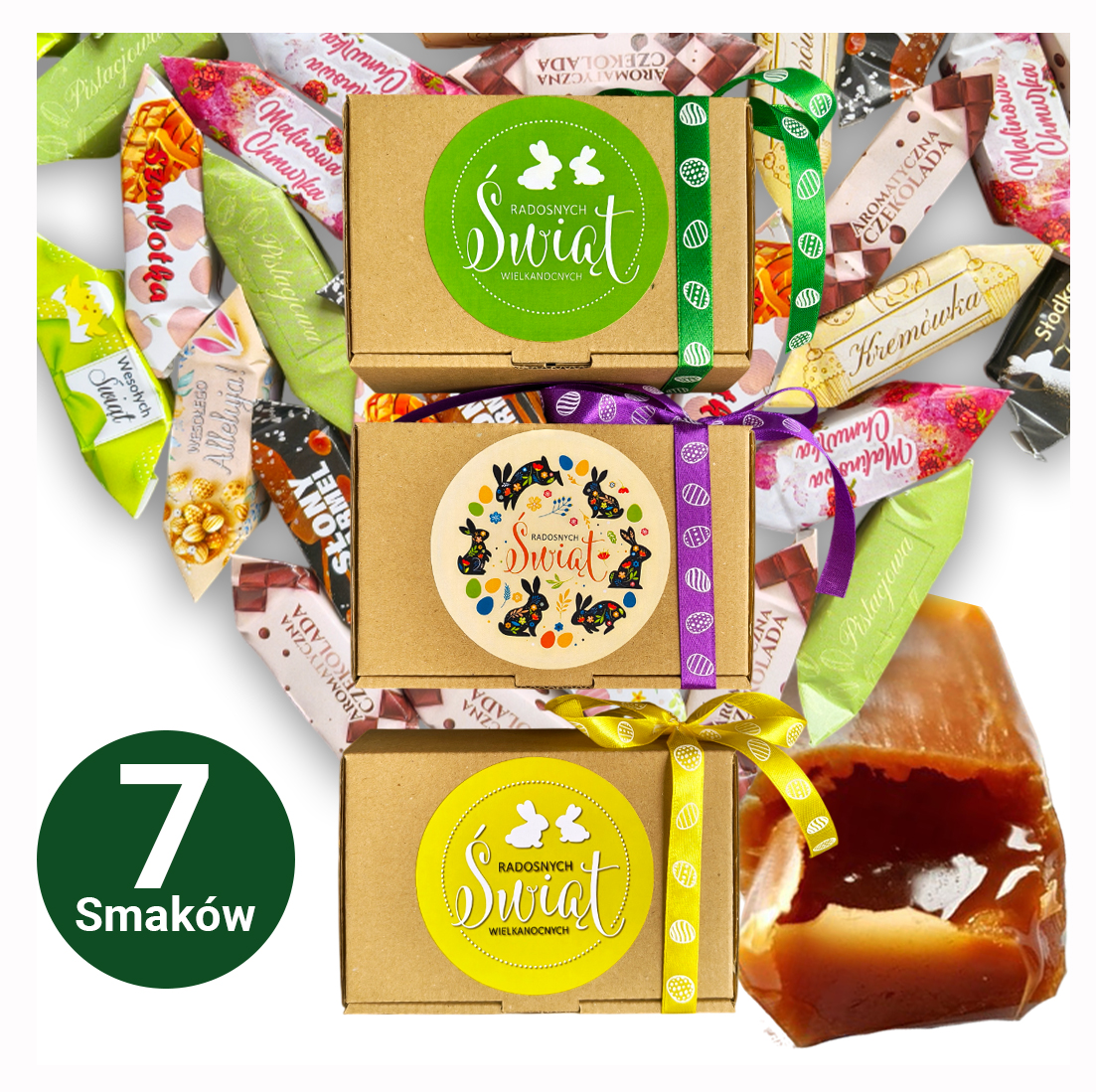 Wybierz kolor wstążki (fioletowy, zielony lub żółty) i podaruj bliskim słodką radość na Wielkanoc w wyjątkowej, zajęczej formie! 🐰🌿🍬