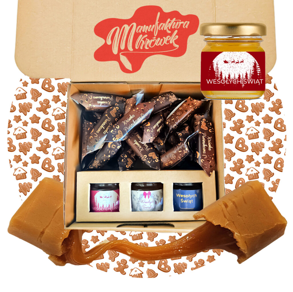Dodatkowo w opakowaniu znajdziecie Państwo pyszne miodki z firmy Uroczy Upominek w świątecznych odsłonach spakowane w box prezentowy. Miód wielokwiatowy.